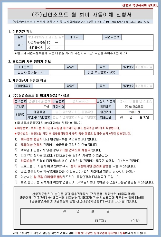 3. (주)신안소프트 자동이체 동의서(위 첨부파일) 작성