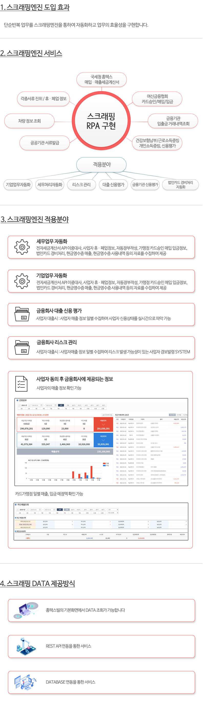 국세청홈택스 매입,매출세금계산서, 여신금융협회 카드승인,매입,입금, 금융기관 입출금 거래내역조회, 건강보험납부, 근로소득증빙, 개인소득증빙, 신용평가 스크래핑